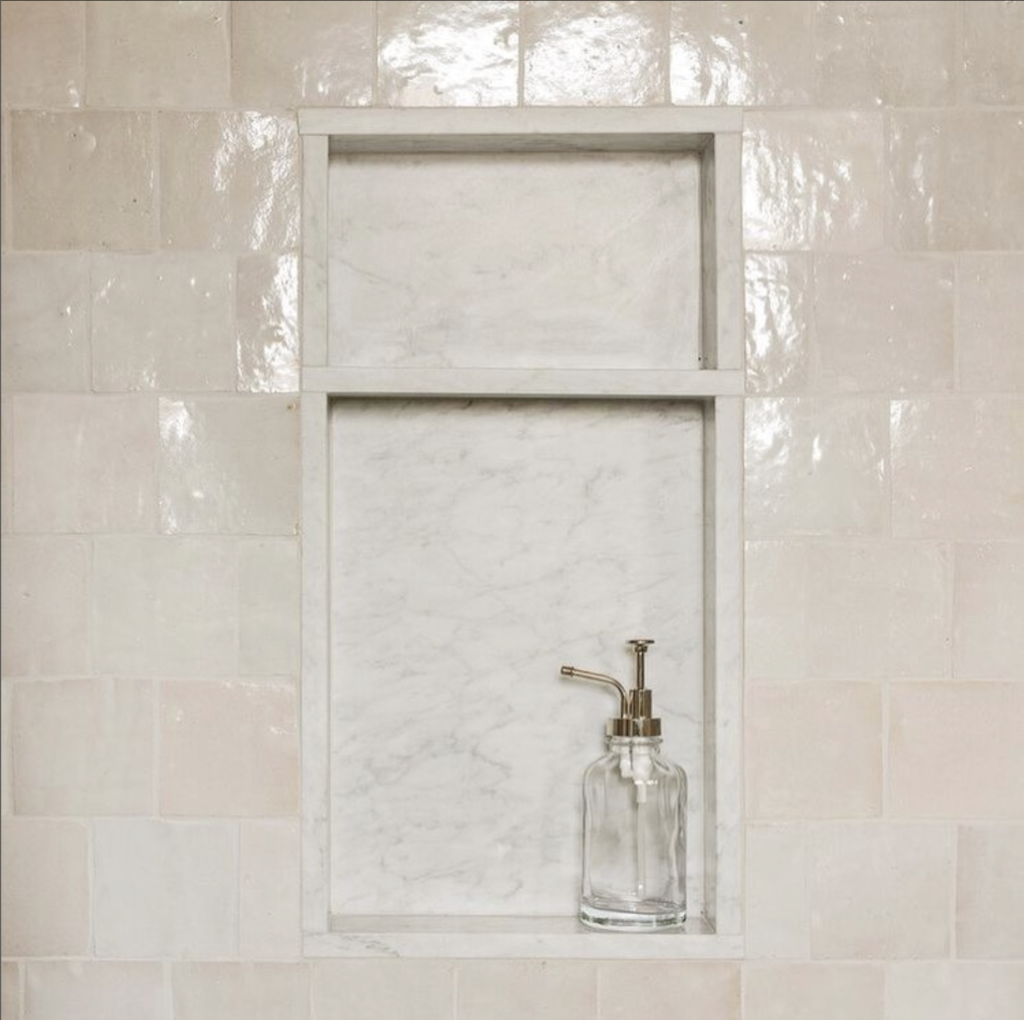 When it comes to bathrooms, we have been seeing subway tile for entirely too long. The time has finally come for subway to move on out with zellige tile replacing it. The natural, shiny, and flawed look of zellige lends little to be desired in the way of texture and character, and my clients are LOVING zellige right now.